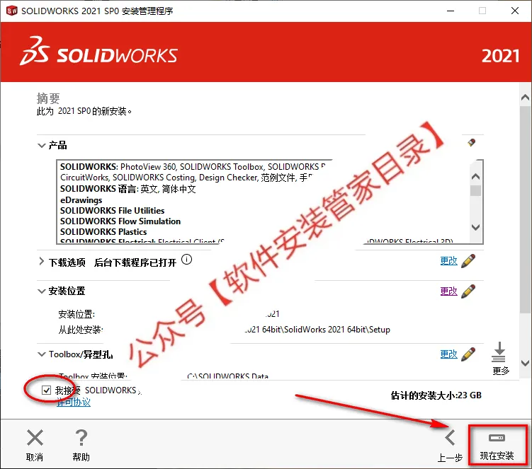 18.勾选我接受SOLIDWORKS条款,点击“现在安装”