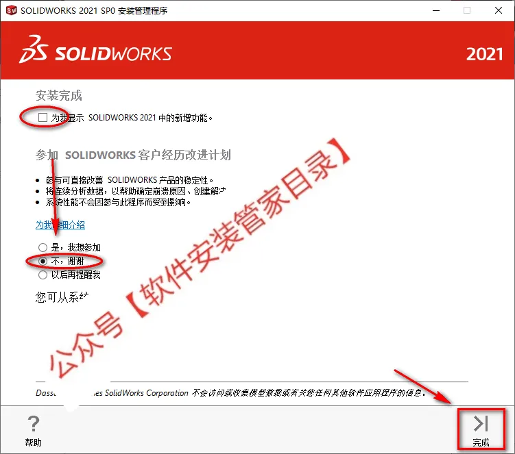 21.取消勾选为我显示 SOLIDWORKS 2021中的新增功能,选择不,谢谢,点击“完成”