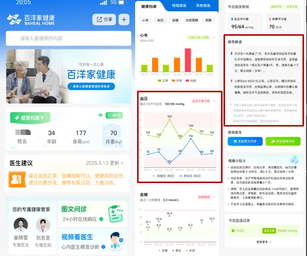 几分钟后,他收到了来自百洋家健康平台医生的反馈:“心电图正常,今日血压监测记得按时完成。”对于这位心脏支架术后患者来说,这种 “居家监测+远程管理”的模式,已经替代了频繁往返医院复查的折腾。