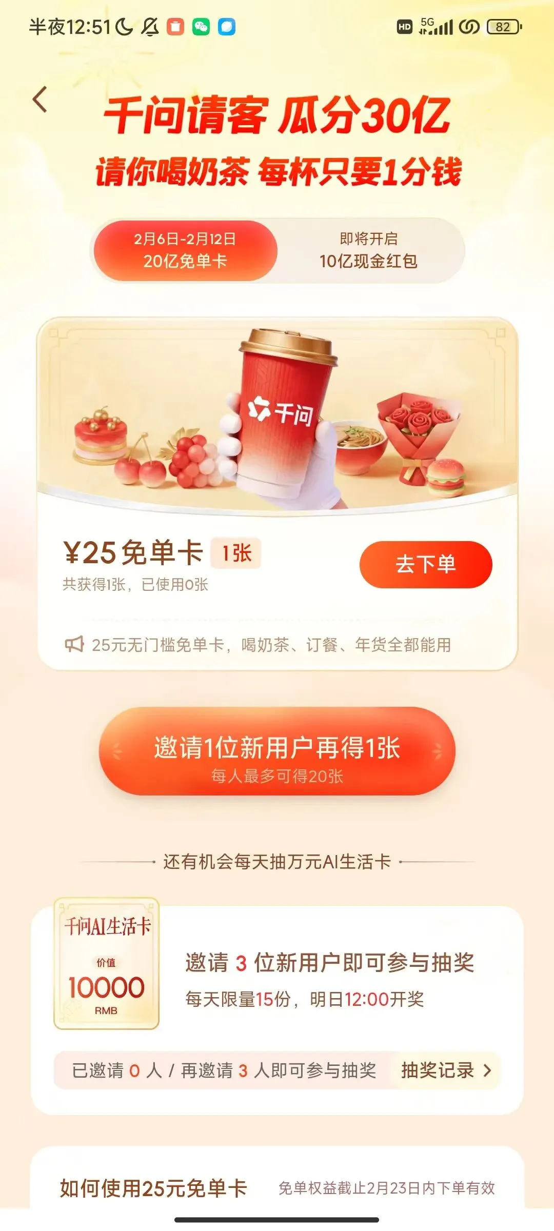 千问app人人25元免单卡!