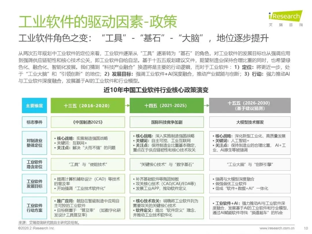 政策支持:从 “十三五” 的 “工具定位” 到 “十四五” 的 “数字基石”,再到 “十五五” 预判的 “工业大脑”,政策持续加码核心技术攻关与 AI + 融合。