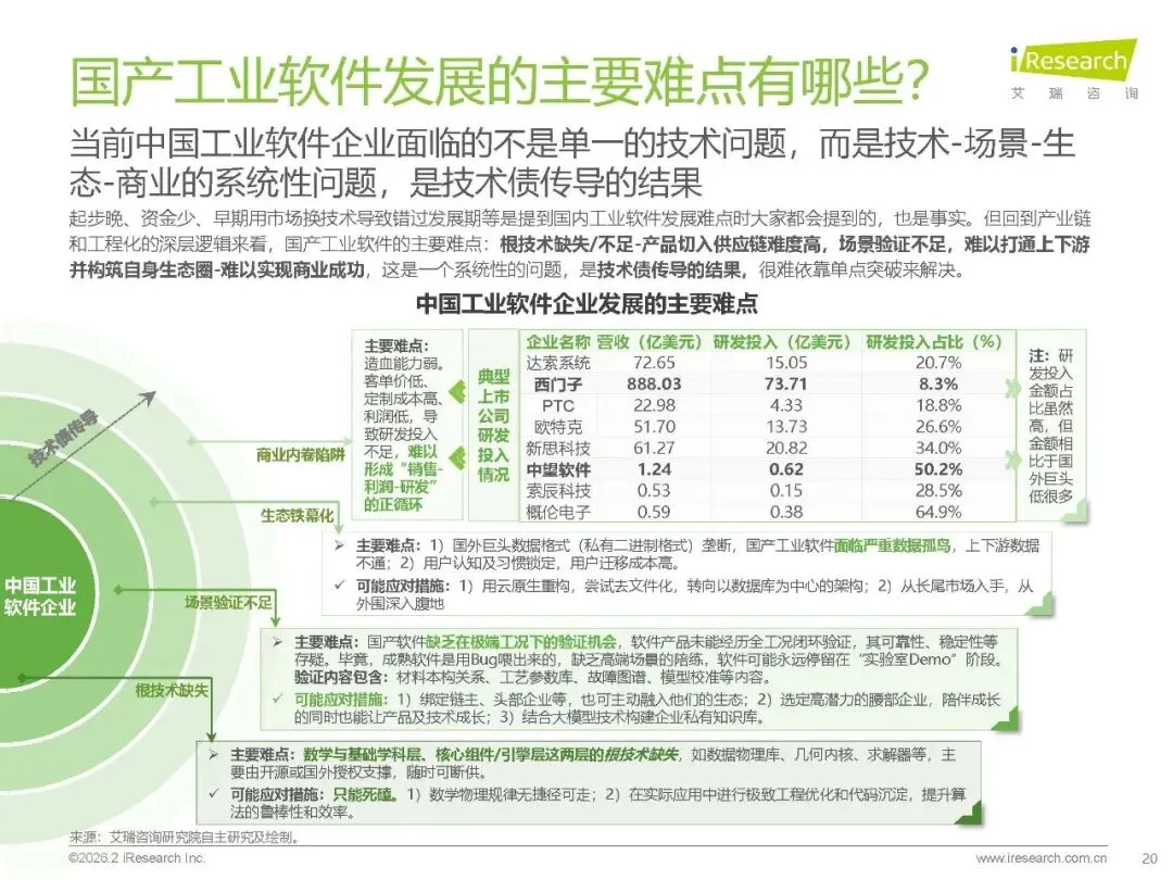 核心痛点:研发设计类软件受困于几何内核、求解器等根技术缺失,缺乏海量工业场景试错导致工程优化不足;产业面临技术债传导的系统性问题,存在生态垄断、用户迁移成本高、造血能力弱等难题。