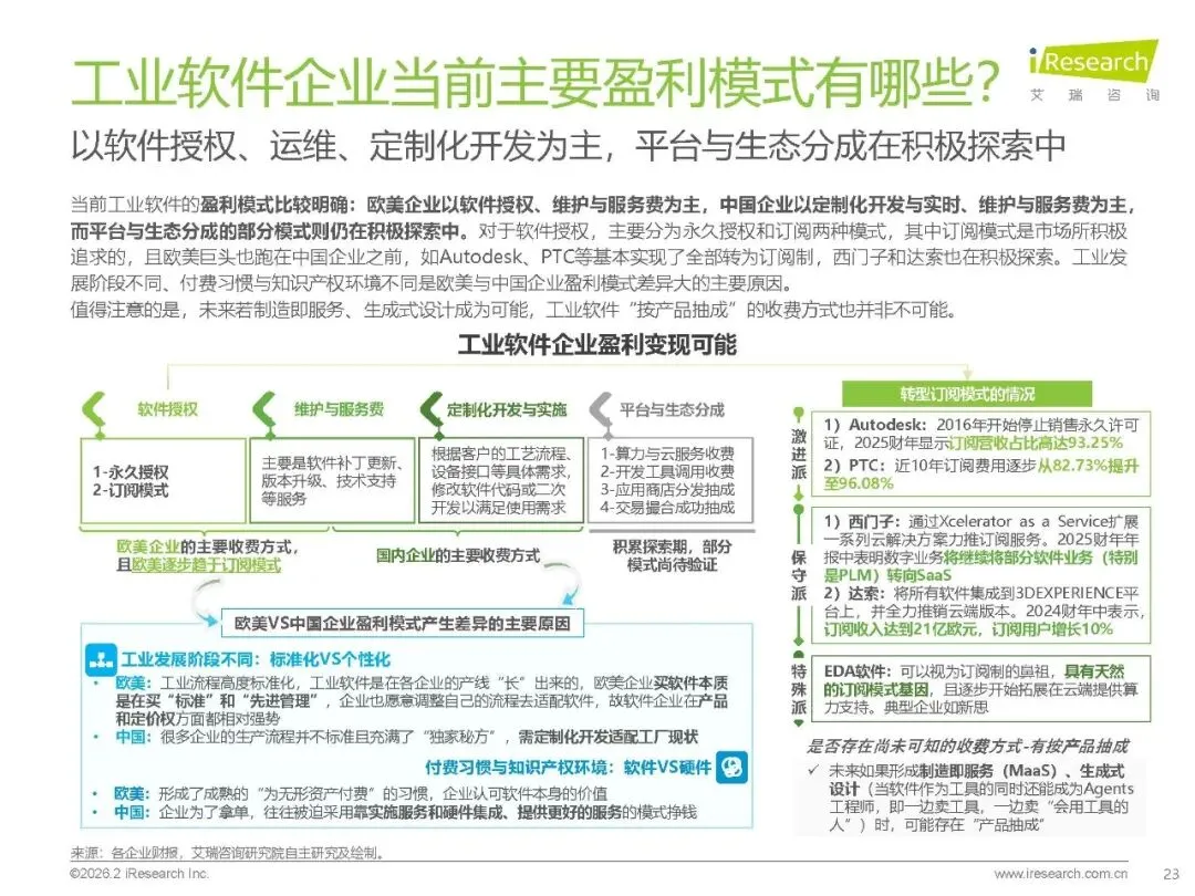 盈利模式:欧美企业以软件授权与订阅制为主(头部厂商订阅营收占比超 90%),国内企业侧重定制化开发与运维服务,平台生态分成、数据增值服务为未来潜在方向。