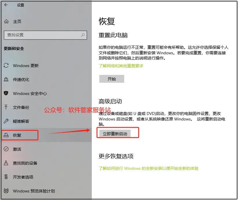 第十九步:选择【恢复】,然后选择【立即重新启动】。