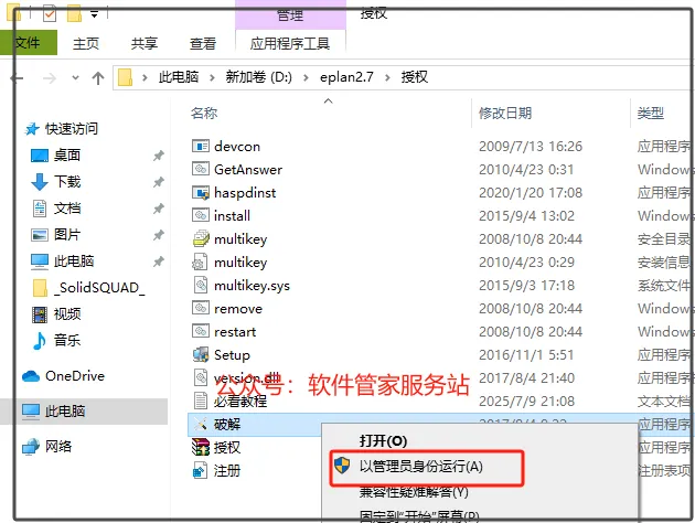 第二十八步:选中【破解】,右击【以管理员身份运行】。