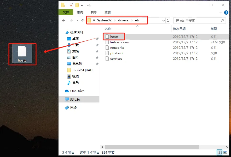 第三步:手动打开电脑C盘中该文件夹路径地址:【C:\Windows\System32\drivers\etc】,将【hosts】文件复制到电脑桌面。(完成后此界面暂时不要关闭)