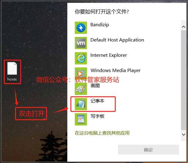 第四步:双击拷到桌面的【hosts】文件,选择用记事本打开。