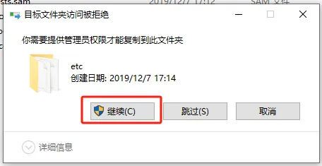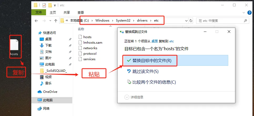 第六步:复制桌面改好的【hosts】文件,并粘贴在【C:\Windows\System32\drivers\etc】目录下,选择【替换目标中的文件】。