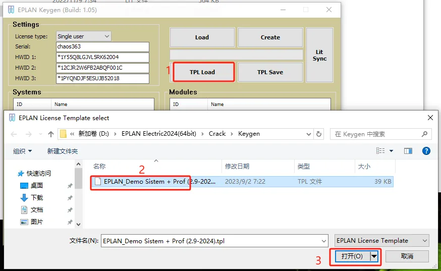 第二十四步:选择【TPL load】,然后再选择【Keygen】文件夹下的【EPLAN_Demo……】文件并点【打开】。
