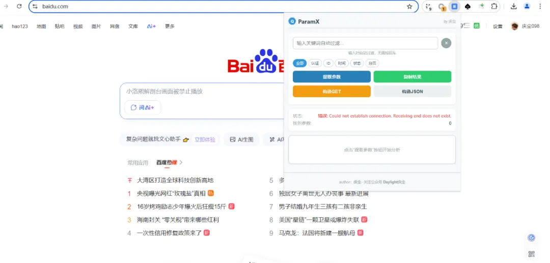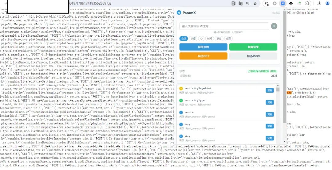 这里是随便找个js举个例子,这个接口可以看到是有标明参数的,我们正常演示插件即可,打开插件,点击提取参数