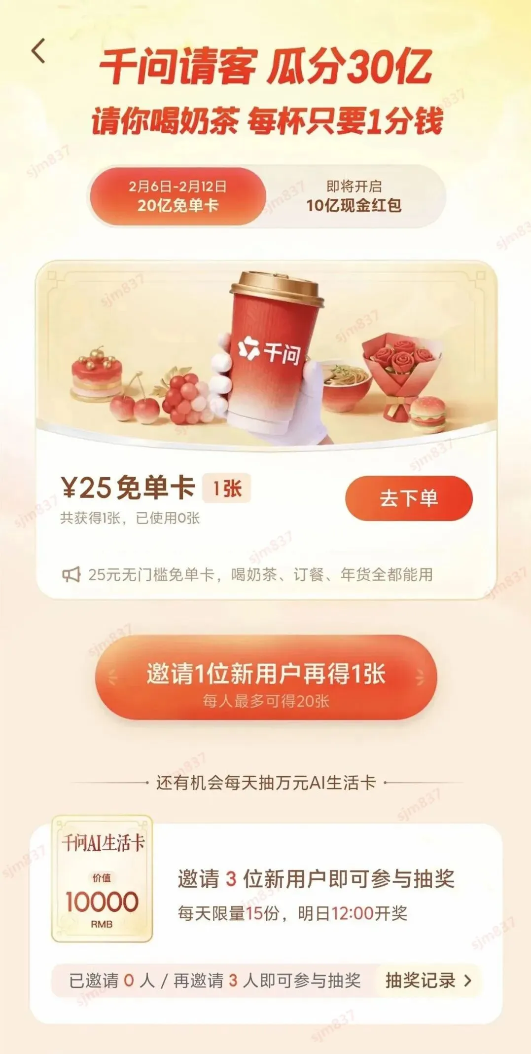春节狂撒30亿!千问App请你喝奶茶,首波领525元免单卡,承包你的吃喝玩乐