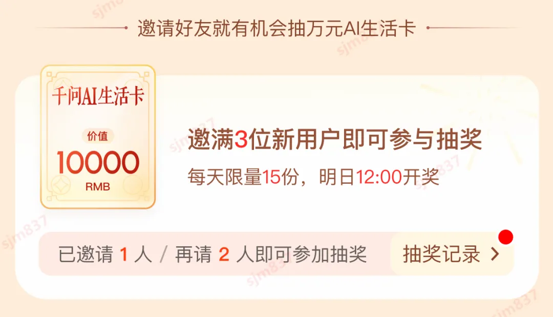 千问AI生活卡:抽万元大奖,现金/权益二选一 :如果你当日累计邀请≥3位新用户,次日12点就可以抽奖啦;要是累计邀满20位新用户,后续每日都能自动获得抽奖资格哦。2月7日到2月13日每日12点开奖,每日抽15人,总共会有105张生活卡哦。奖品可以二选一,你可以选择①万元商超外卖免单卡(30元×365次),也可以选择②万元机票火车票酒店立减券,还能换成③5000元现金红包(支付宝发放)哦。不过中奖后要在48小时内完成信息填写,不然就作废了哦。权益2月18日生效,有效期365天,个税由平台代扣代缴。 -