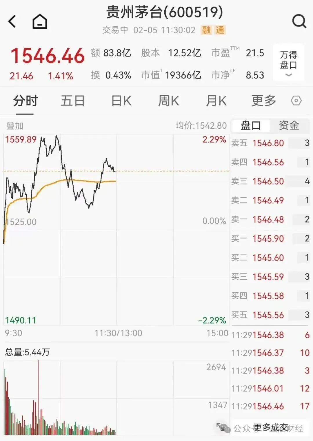 值得注意的是,或受春节行情提振,贵州茅台股价开启“大反攻”,自1月29日以来,公司股价6天已涨超16%,重新站上1500元。截至今日午间收盘,报1546.46元/股,涨1.41%,总市值为19366亿元,超越中国石油,居A股市值排行榜第五。