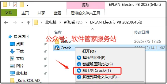 第十五步:返回第二步解压的文件夹,找到【Crack】压缩文件,右击解压到【Crack】。(注意:解压前需关闭电脑杀毒软件、防火墙等,避免激活文件被误删;若被误删,关闭后重新解压安装包)
