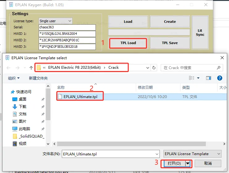 第二十三步:选择【TPL load】,然后再选择【Crack】文件夹下的【EPLAN_Ultimate】文件并点【打开】。