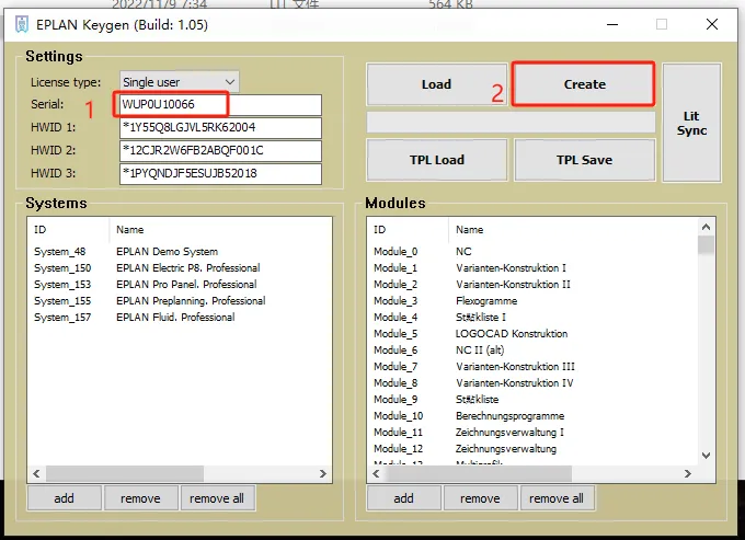 第二十四步:在【Serial】处输入【WUP0U10066】,点击【Create】。