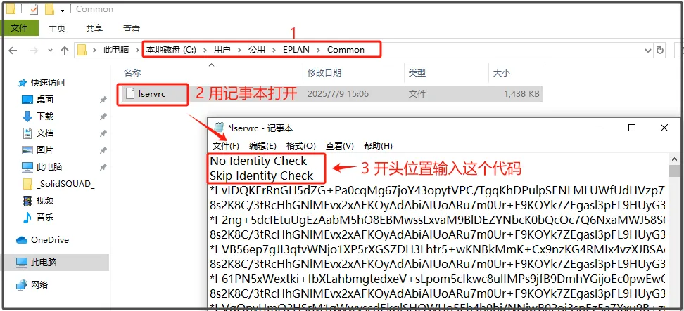 第二十七步:手动打开【C:\Users\Public\EPLAN\Common】目录,双击【lservrc】文件并以记事本打开,在文件开头位置输入以下代码。