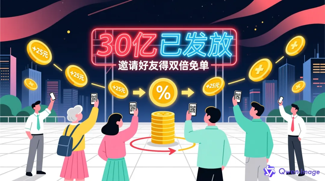 每成功邀请1位新用户下载并注册千问App,你和好友各得1张25元免单卡 - 每人最多可获得21张