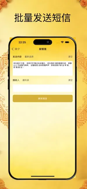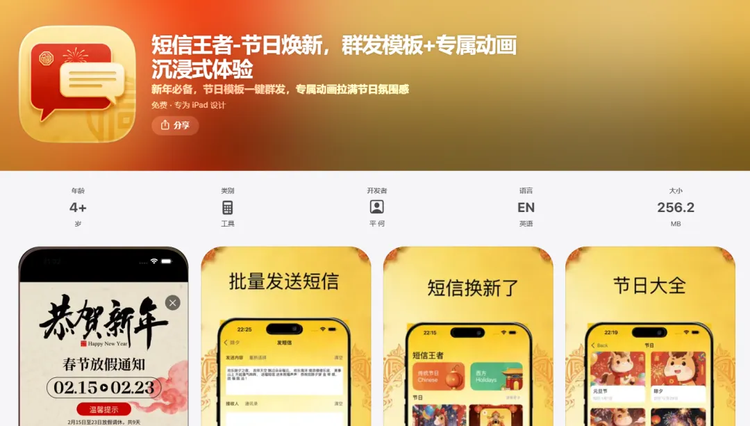 还在为节日发祝福绞尽脑汁编辑短信?还在苦恼群发短信操作繁琐、逐个发送耗时费力?还在遗憾普通短信缺乏仪式感,无法传递满满的节日氛围?「短信王者」重磅上线,作为一款专为用户打造的全能短信管理工具,集智能群发、全节日模板、专属动画于一体,重新定义短信沟通方式,让每一次消息发送都有温度,每一个节日都有专属仪式感,成为你新年必备的通讯好帮手!无论是春节拜年、元宵祈福、端午安康、中秋团圆等传统节日,还是国庆、七夕等特色节日,短信王者都能一站式搞定,让短信发送更高效、更便捷、更有氛围感,告别繁琐操作,解锁短信新体验!作为深耕短信工具领域的优质应用,短信王者从用户核心需求出发,打造了轻量化、高便捷、强体验的产品体系,无需复杂操作,无需占用过多手机内存,打开即可使用,适配 iPhone 全系列机型,兼容 iOS 全版本系统,运行流畅不卡顿,为你带来极致的使用体验。我们深知,在快节奏的生活中,高效的通讯方式尤为重要,因此将一键群发功能做到极致,解决了传统短信逐个发送、操作繁琐的痛点。在短信王者中,你可以自由选择通讯录联系人,支持单人选、全选等多种选择方式,一次操作即可将短信发送给所有目标联系人,省去反复编辑、反复发送的时间,大幅提升短信发送效率。节日祝福群发一键搞定,省时又省心。为了让节日祝福更有心意,无需你花费时间构思文案、编辑内容,短信王者打造了全节日专属短信模板库,覆盖全年所有主流节日,春节、元宵、端午、中秋、国庆、七夕、元旦、重阳、圣诞、平安夜等应有尽有,满足不同场景、不同人群的发送需求。所有模板均由专业文案团队精心打造,语言优美、寓意美好,贴合节日氛围,你只需打开对应节日分类,选择喜欢的模板,轻轻一点即可一键套用,也可根据自己的需求对模板内容进行简单编辑修改,添加个性化文字、表情,让节日祝福既省心又有专属心意。同时,模板库会持续更新,紧跟节日潮流和网络热点,不断新增优质模板,让你的节日祝福永远不重样、永远有新意。更值得一提的是,短信王者独有的节日专属动画功能,彻底打破了传统短信纯文字、无画面的单调形式,为每一个节日打造了定制化的动态动画,让节日祝福更有氛围感、更有仪式感,给玩家带来全新的视觉体验和暖心感受。我们为每个节日设计了专属的动画风格,春节的喜庆红金、元宵的温馨花灯、端午的清新粽叶、中秋的皎洁明月、国庆的庄严红旗,每一款动画都贴合节日主题,画面精美、动态流畅,充满节日气息。而且,节日当天自动弹窗动画,无需你手动操作,在节日当天打开 App,就会收到对应的节日动画弹窗,沉浸式感受节日氛围。在使用体验上,短信王者始终坚持极简设计、便捷操作的原则,打造了清晰直观的界面布局,功能分区明确,新手也能快速上手,无需学习即可轻松操作。一键点击即可进入对应页面;节日专区实时更新当前临近节日,专属模板、专属动画一键直达,让你提前准备节日祝福,无需错过任何一个重要节日;通讯录同步功能,可快速同步手机通讯录联系人,让群发选择更高效;同时,我们注重产品的细节打磨,优化了每一个操作步骤,减少无效点击,让每一次操作都流畅顺滑。短信王者的适用场景覆盖生活、工作、社交的方方面面,是一款真正的全能短信工具,满足你所有的短信需求。在节日场景中,春节、中秋、国庆等重要节日,发送祝福,氛围感拉满,让亲友感受到满满的心意;在社交场景中,朋友生日用个性化的短信传递关心,让沟通更暖心。无论是年轻人还是中老年人,都能轻松使用短信王者,年轻人可以感受到节日祝福,中老年人可以用它一键群发节日问候,无需复杂操作,就能享受高效、便捷的短信服务。新年焕新,升级!「短信王者 」作为新年必备的短信神器,不仅为你解决了短信发送的所有痛点,更用专属模板和定制动画,为每一个节日增添了满满的仪式感和氛围感。我们始终坚持以用户为中心,持续优化产品功能,不断更新模板库和动画库,根据用户的反馈和需求,打造更贴合用户使用习惯的产品体验。同时,我们注重用户的隐私安全,严格保护用户的短信内容、通讯录信息等个人隐私,所有数据均本地存储,无需担心信息泄露,让你使用更放心。告别繁琐的短信操作,告别单调的文字祝福,选择「短信王者」,解锁短信沟通的新方式!一键群发高效便捷,全节日模板随心用,专属动画拉满氛围感,全方位管理有序高效,让每一条短信都有温度,每一个节日都有专属体验。无论是新年拜年,还是其他节日,短信王者都能成为你最贴心的通讯帮手,让沟通更高效、更便捷、更有氛围感!现在下载体验,开启你的节日焕新通讯之旅,让每一次消息发送,都成为一次美好的传递!