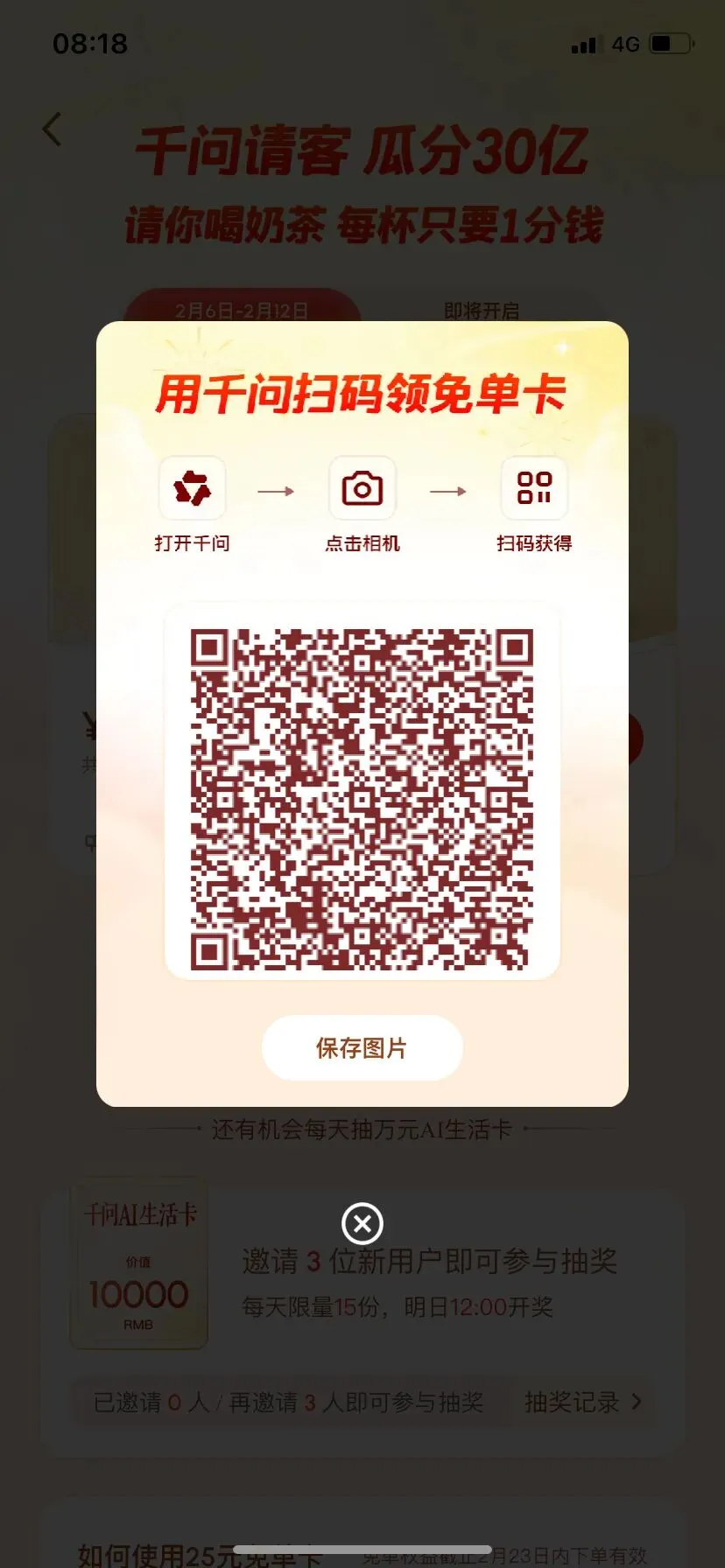 免费奶茶下载千问app,下载完打开app登陆点击相机扫码,免费送25元奶茶券,领了白天再点就可以