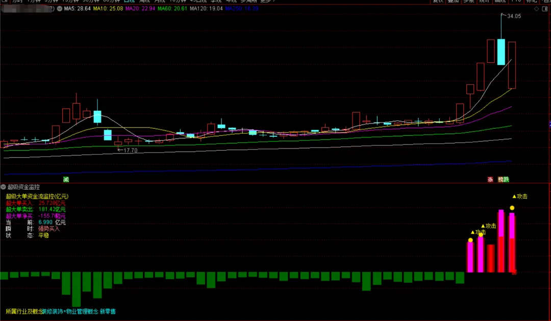 DRAWTEXT(一般攻击, 超大单分钟净额*1.35, ‘▲攻击’), COLORYELLOW;