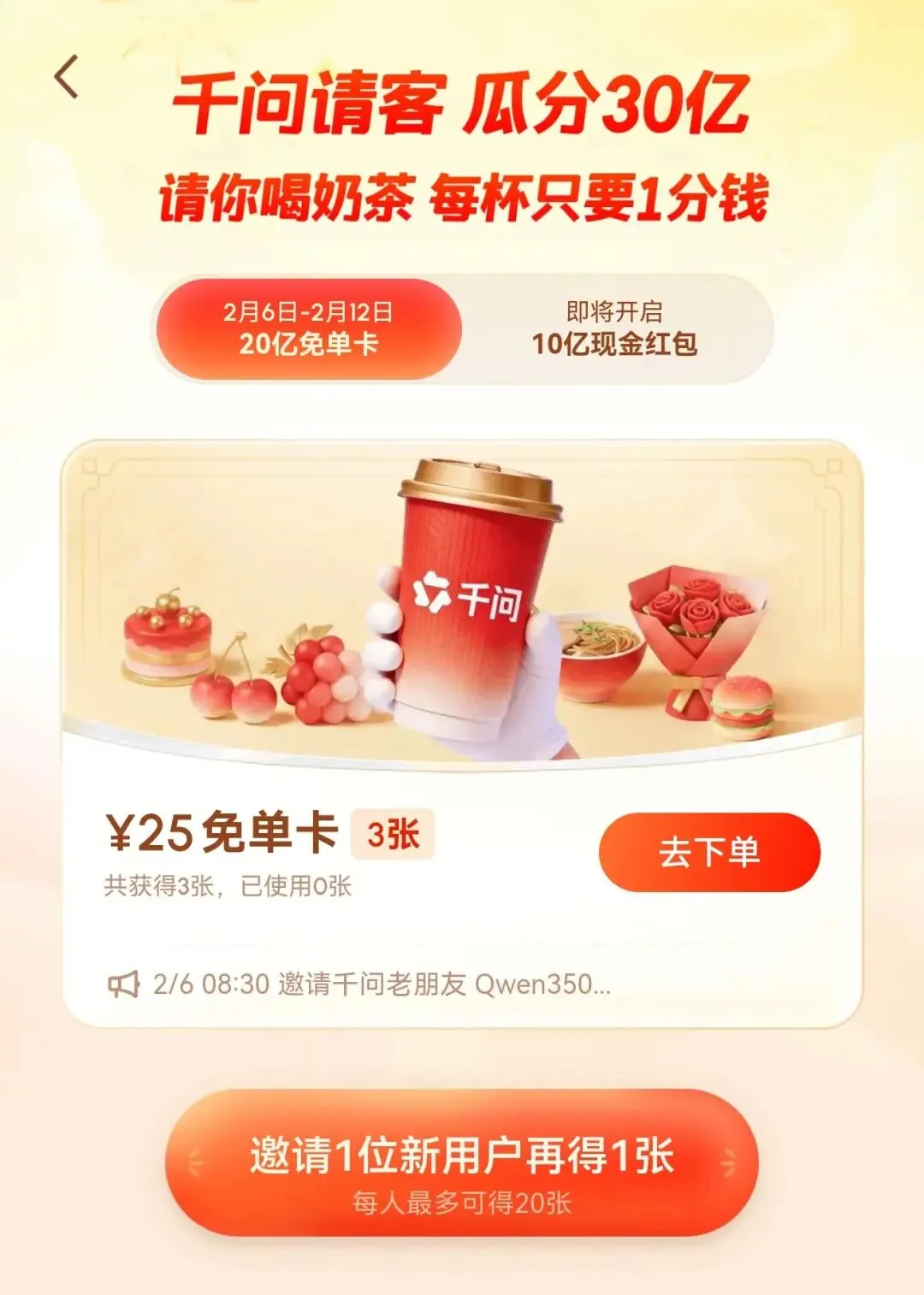 注意!千问App可免费点奶茶,每人可领525元免单卡!速看
