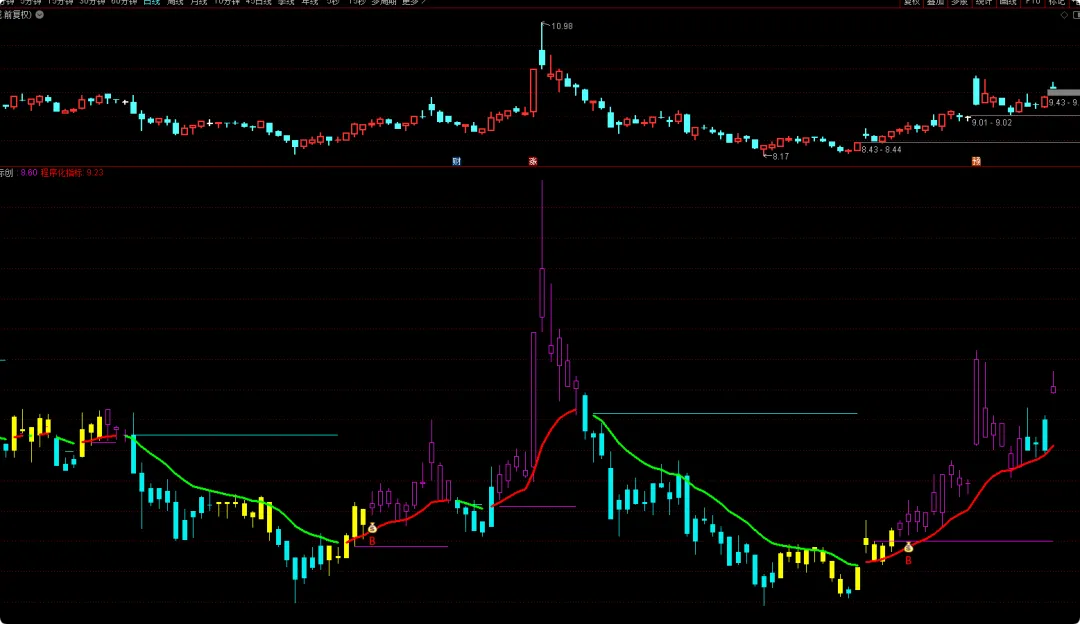 程序化指标:IF(动13日>=0,均13日,DRAWNULL),COLORRED,LINETHICK3;