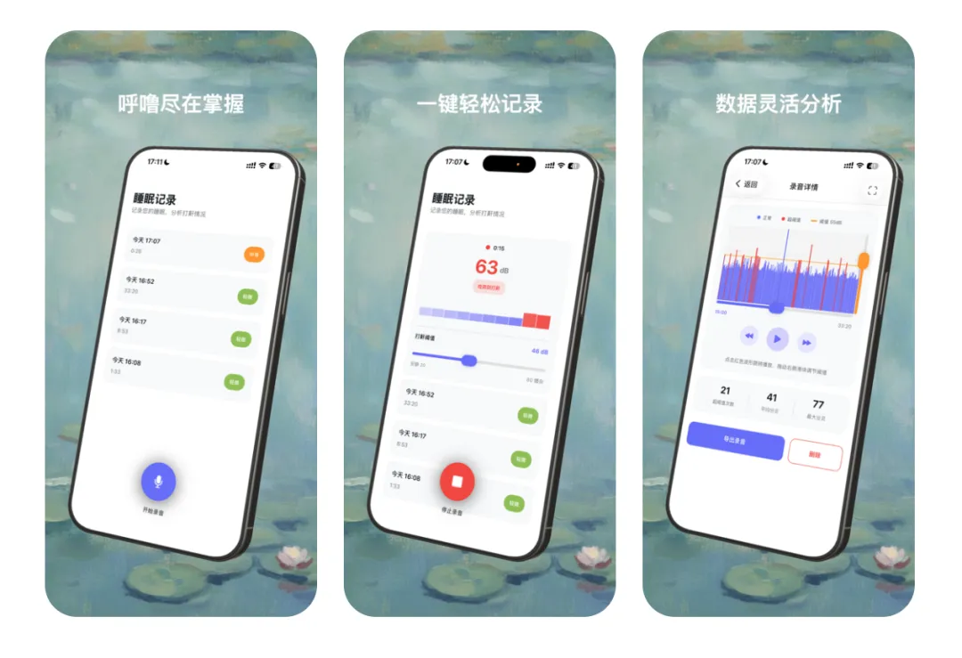• 可调节、可验证:点开某段录音,可以通过调节分贝阈值快速定位“疑似打鼾”时段,并立即回听确认。 -