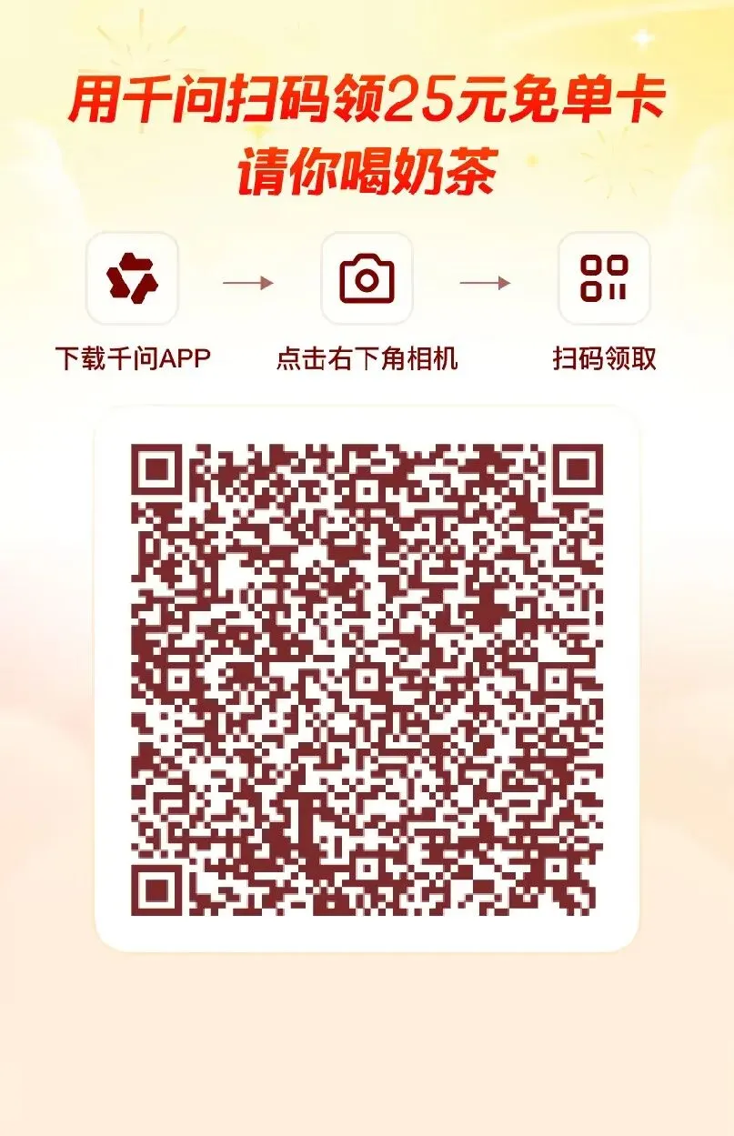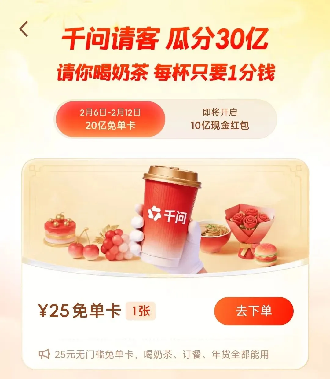 所有用户先更新千问App到最新版,打开后都能白拿一张25元无门槛免单卡,不仅能免单喝奶茶,也能通过淘宝闪购买年货、点外卖。