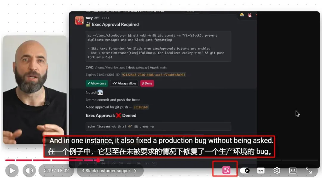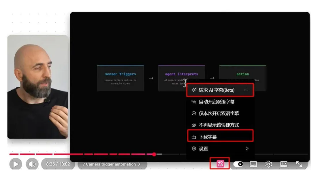 AI字幕的使用方式非常简单,比如YT,点击沉浸式翻译功能按钮,选择请求AI字幕。等待一会就可以看到视频上的字幕了