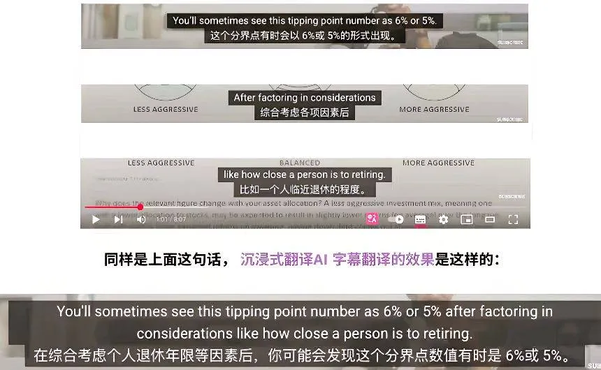 沉浸式翻译的AI字幕功能用大语言模型做了智能断句+母语化调整,沉浸式会借助AI模型,能在保持高准确率的同时,完全符合中文的表达习惯;