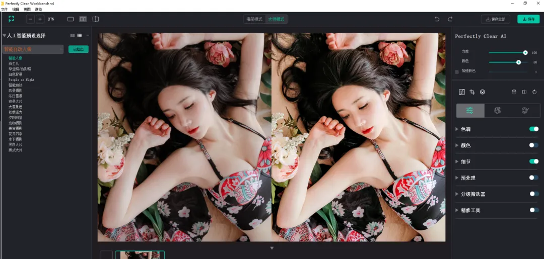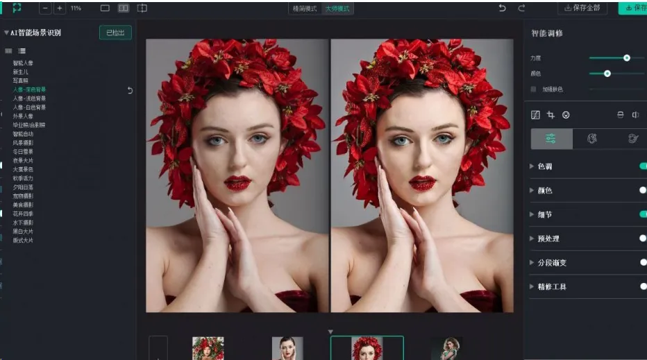 打开软件,导入照片,它会自动判断是风景还是人像,并智能选择最合适的调色方案。不需要你一一试错,效率直接翻倍。