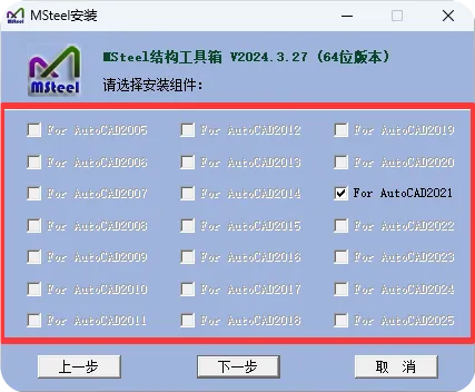 勾选需要挂接的CAD版本(如AutoCAD 2020/2024等),点击下一步。