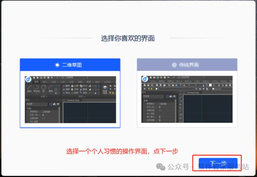 第六步:选择一个习惯的界面,然后点下一步。