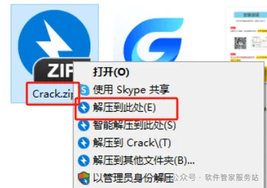 第十步:打开解压后的文件夹,找到Crack,右击解压到此处。(注:解压前一定关闭电脑杀毒软件、防火墙,避免激活文件被误删或修改,导致文件无效;若解压后没有文件可能是被误删,关闭电脑杀毒软件、防火墙后重新解压【Crack】压缩包)