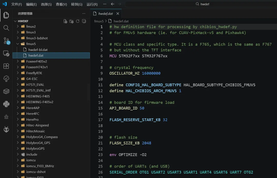 由于经常定制各种 APM(ArduPilot)飞控硬件,时常与硬件定义文件(hwdef)打交道,受够了没有语法高亮的苦。每次打开 hwdef.dat 文件,都是一片纯文本,关键字、引脚定义、外设配置混在一起,看得眼睛都花了。特别是配置复杂一点的板子,几百行的 hwdef 文件,找某个引脚定义都要仔细看半天,效率极低。最终在 AI 的协助下,做了这个 ArduPilot 硬件定义文件语法高亮的插件,效果如下: