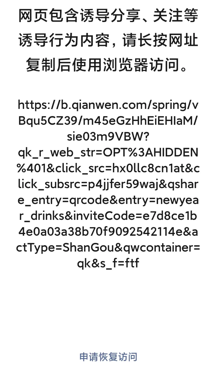 值得注意的是,继微信封杀自家腾讯元宝、百度文心助手后,千问的红包分享链接也被微信屏蔽,页面显示网页存在诱导或误导下载/跳转的内容,需要跳转第三方浏览器访问。