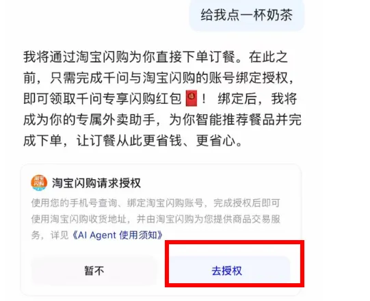 下载千问App,然后登录账号,迫不及待下达了指令:“给我点一杯奶茶”,因为第一次使用,所以会有授权请求,将千问和淘宝闪购进行绑定,这个可以理解,点击授权就可以了: