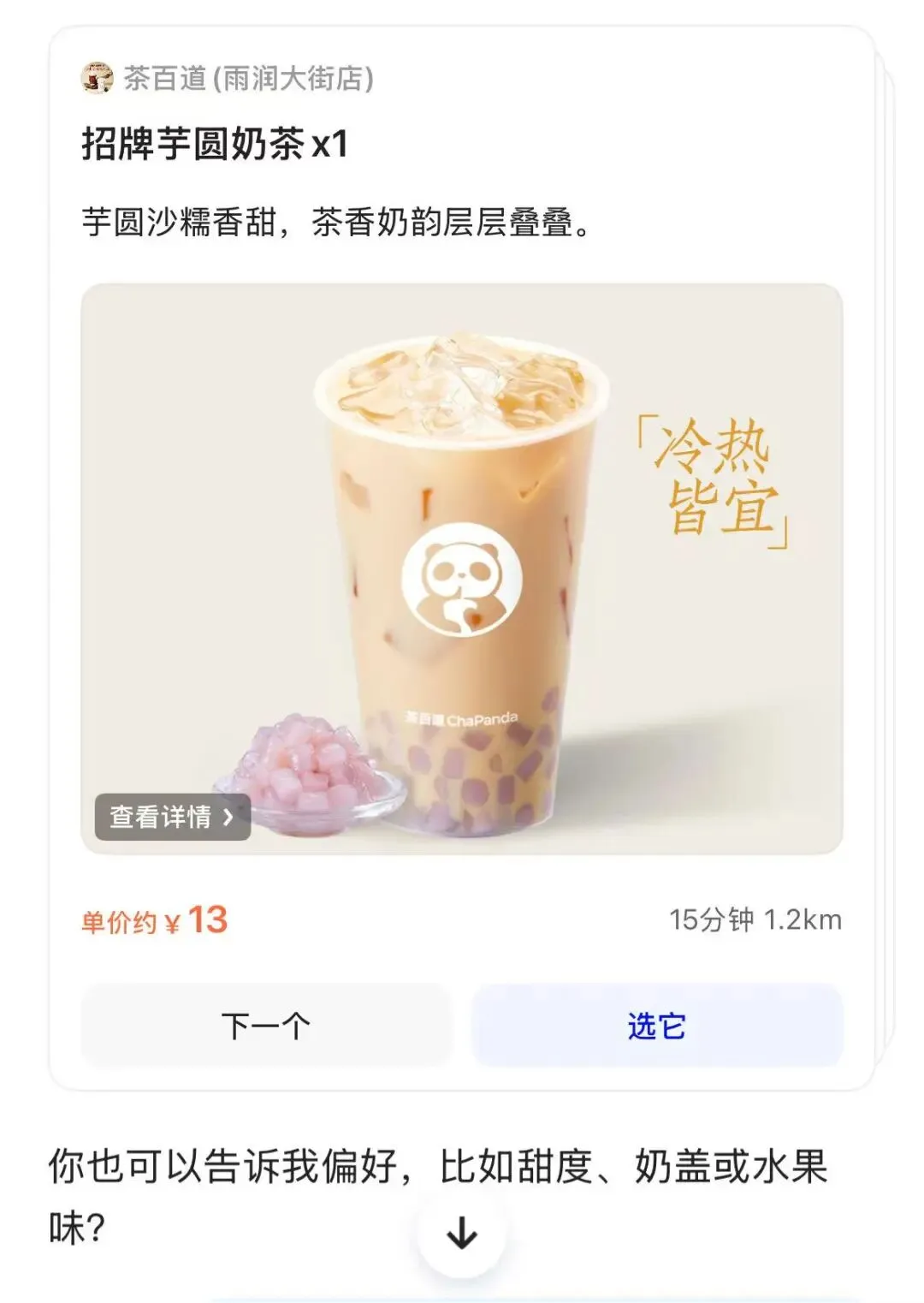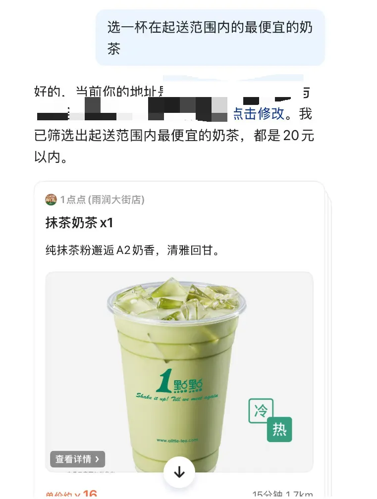 继续下指令“给我点一杯奶茶”(像不像你的领导让你买奶茶,啥也不说,也不说啥味道,也不说大杯小杯,也不说热的冷的,哈哈哈,对,我就是故意的……)。然后千问给我的答案,还是挺另我惊喜的:
