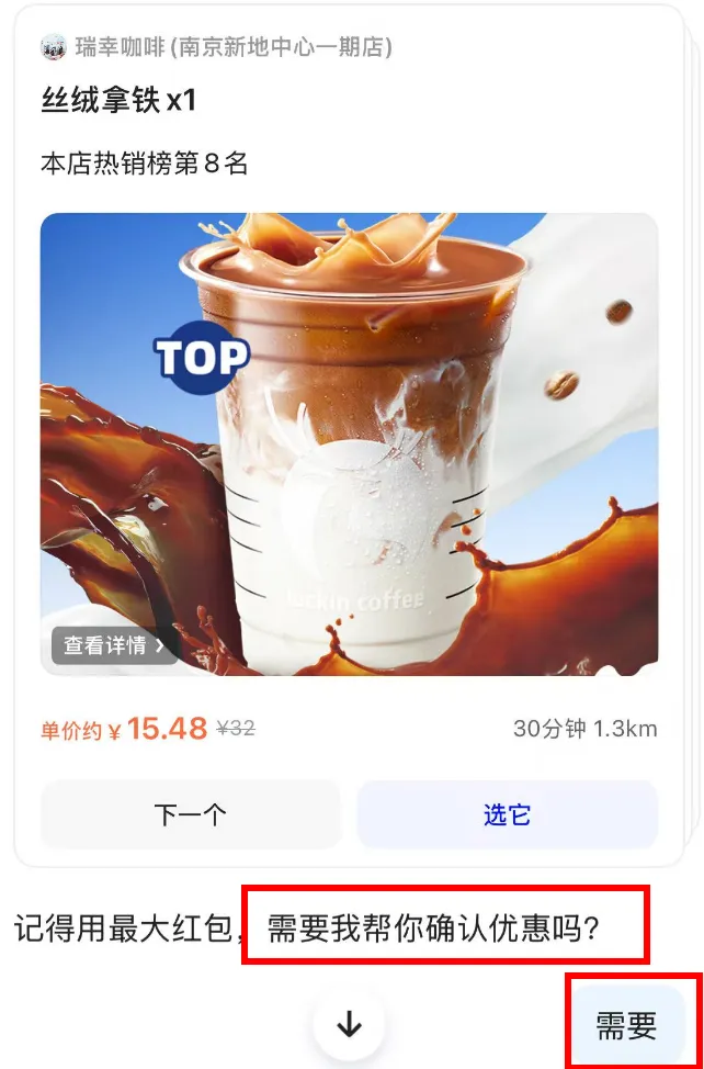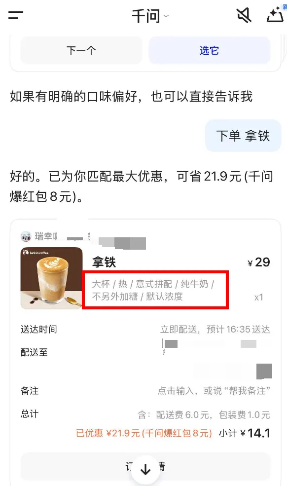 这次必须得夸!就是我想要的!好员工!还要跟我确认一下优惠,那当然好啊,确认“需要”,然后“选它”!绑定支付宝,接着就是美滋滋地等着我的丝绒拿铁,想想都美啊!我也是有小秘可以支配的人啦,科技让我自由,科技让我自尊!15分钟后,电话就响了,兴冲冲跑下去,拿来快递,赶紧拆开,迫不及待来一口香醇!呃……啥味儿!这是啥味儿!拿起我的咖啡杯,上面写着“大杯热拿铁+纯牛奶”!我的丝绒呢?赶紧打开千问,好家伙!!!在跟我确认优惠的时候,还偷偷把我的丝绒拿铁换成了拿铁啊!