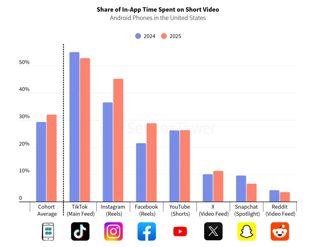 上图:短视频在应用内观看时长占比(美国安卓手机用户)