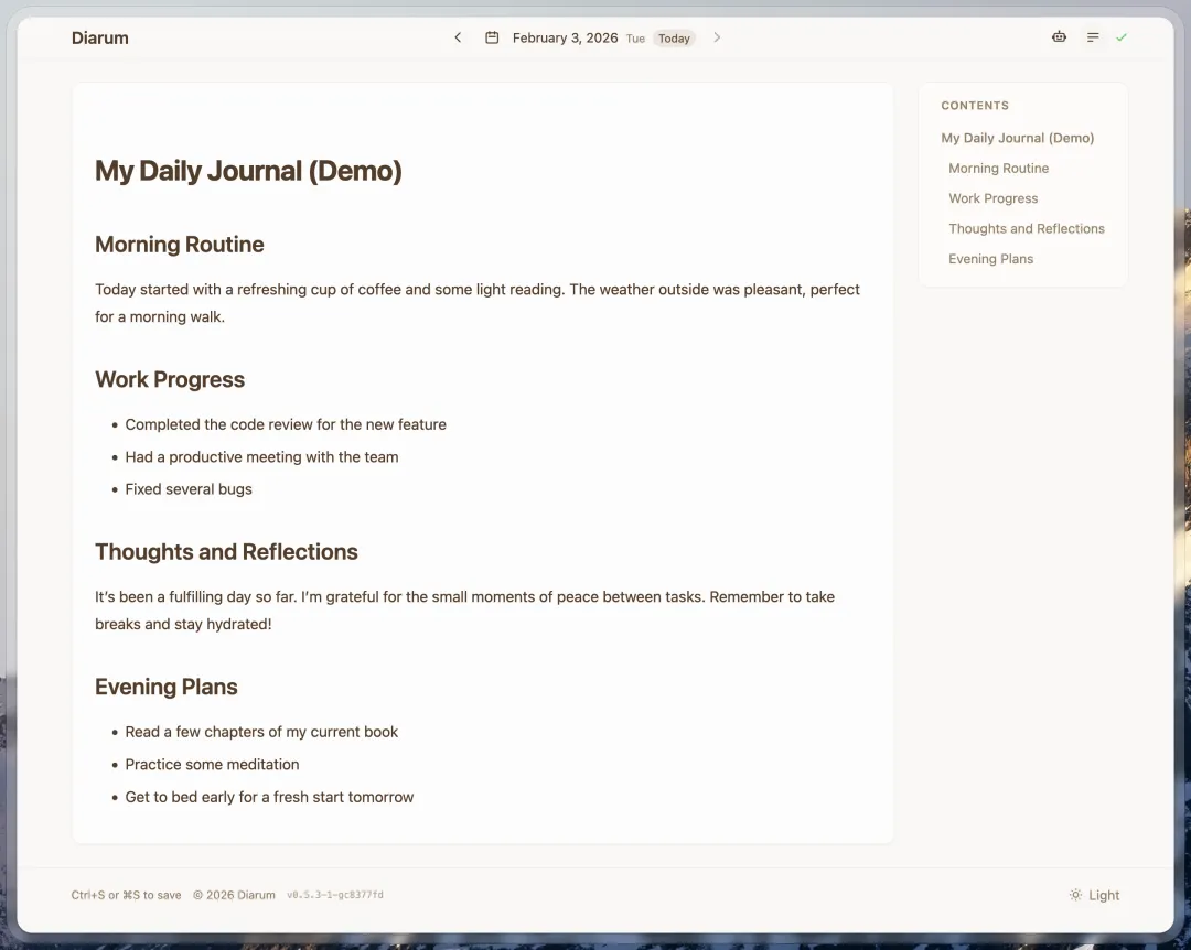 工具用多了,反而开始想记录点什么。不是那种社交媒体的展示,而是真正给自己的思考留个痕迹。Diarum这个自托管日记应用就很特别,它集成了简单的RAG系统,配置好AI后,对话时可以把相关的日记放入上下文进行分析总结。
