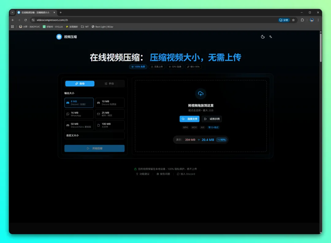 还有件事我挺在意的——隐私。压缩视频时总担心文件被上传到不明服务器。videocompressors这个在线工具直接在浏览器里本地处理,是一款真正保护隐私的视频压缩软件,最大支持2G文件,各种格式都能应付。
