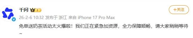 2月6日一早用户火爆参与,活动上线不到3小时,用千问APP下单超100万单奶茶。网友纷纷评论“已经薅到羊毛了”“这羊毛不薅简直亏”……