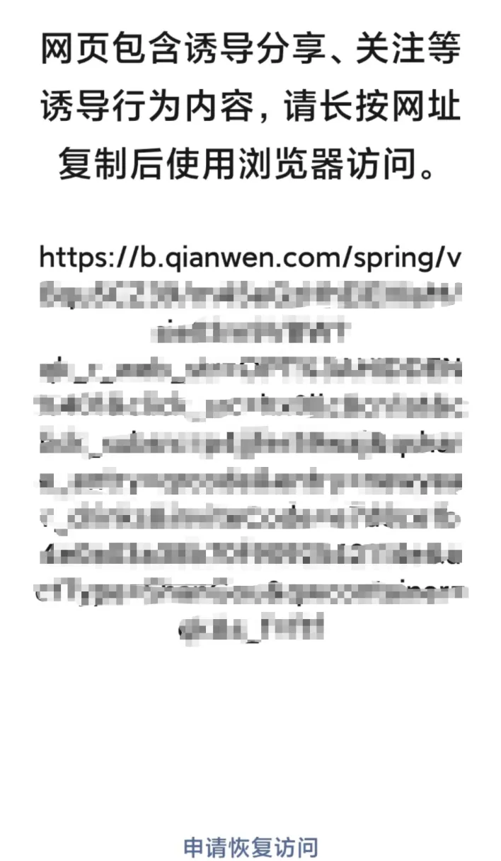 需要注意的是,继微信“封杀”元宝红包链接,千问的红包分享链接也被屏蔽,页面显示网页存在诱导或误导下载/跳转的内容,需要跳转第三方浏览器访问。