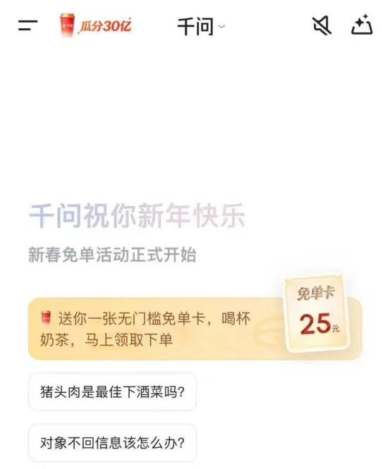 千问App春节30亿大免单:AI一句话下单“请客”全国