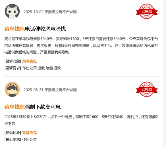 近期就有网友反馈自己遭遇了一个叫菜鸟钱包借钱app的网贷高炮,就是贷款周期只有5天4天时间而已,而且都是等你注册完app填完信息之后就自动给你下款了,或者有些网友反馈说自己填完打算申请贷款的,但是看到额度只有3000元就没再申请了,但即使没申请也会被强制下款贷款了!