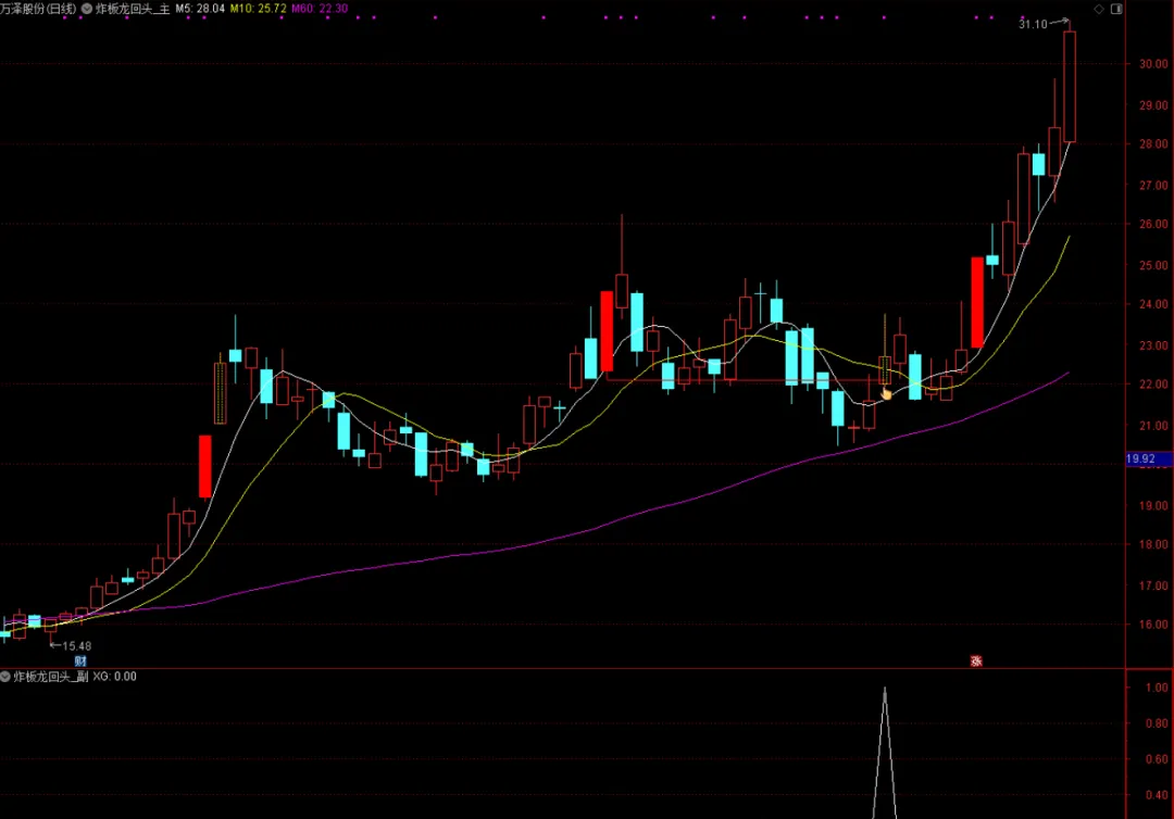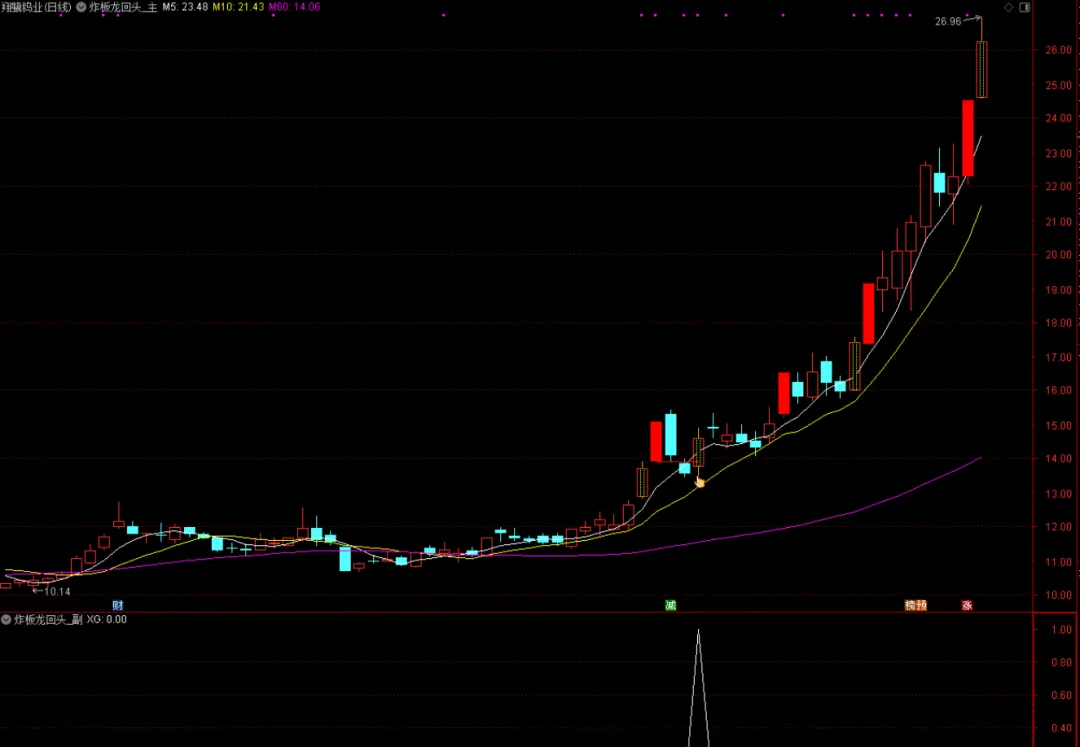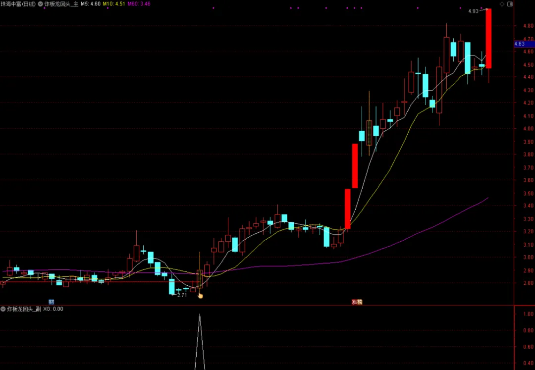 主图信号展示案例中手指位置为炸板位置,红色水平线表示前面首板最低点。