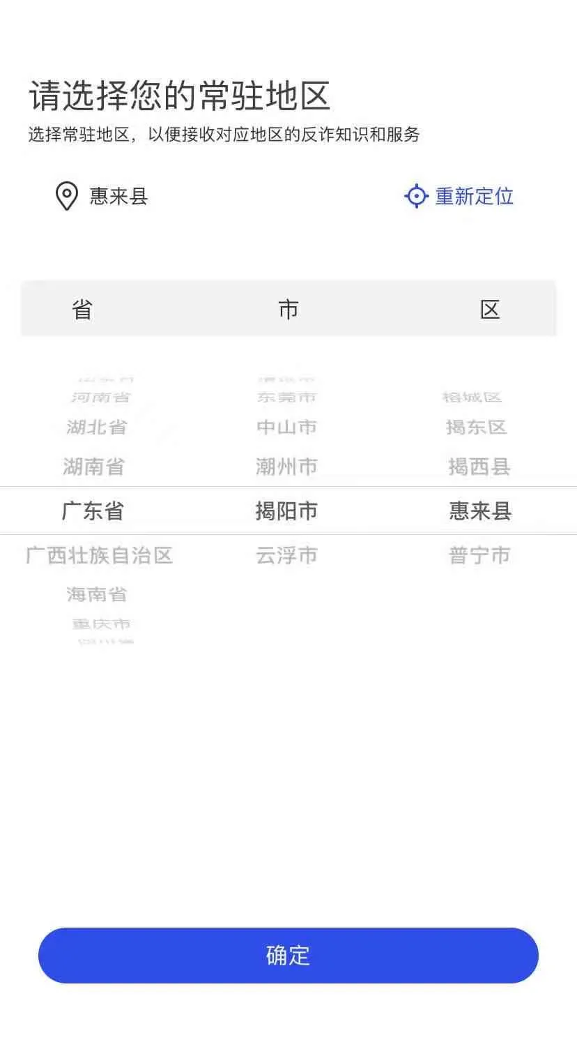 选择常驻地:安装成功后,打开国家反诈中心APP,选择你的常驻地区:依次点击广东省–揭阳市–惠来县,点击下方的确定。