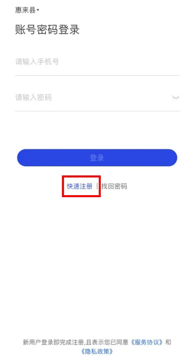 注册:点击快速注册,输入信息并点击确认。